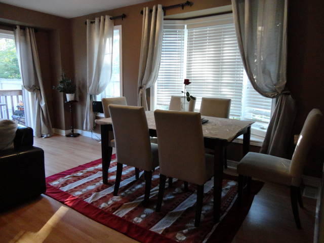 The kitchen opens to a large living /dining area with high quality laminate floors and a bay window, and from here, one can proceed through a walkout to the deck and backyard.